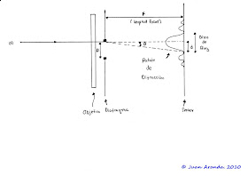 creates inteferencia pattern above, which is a first illuminated circle (called Airy disc) and a series of concentric rings alternating dark and bright concentric rings. The brightness of these rings fell sharply as we go away from the center. Is what the wave shown in the diagram. The theory of Fraunhofer diffraction (Optica. Hecht-Zajac, American Educational Fund, pp.372-375) states that, for circular cracks, the angle θ formed by the lens optical axis and the starting position of the first ring Dark is calculated using the formula: λ
